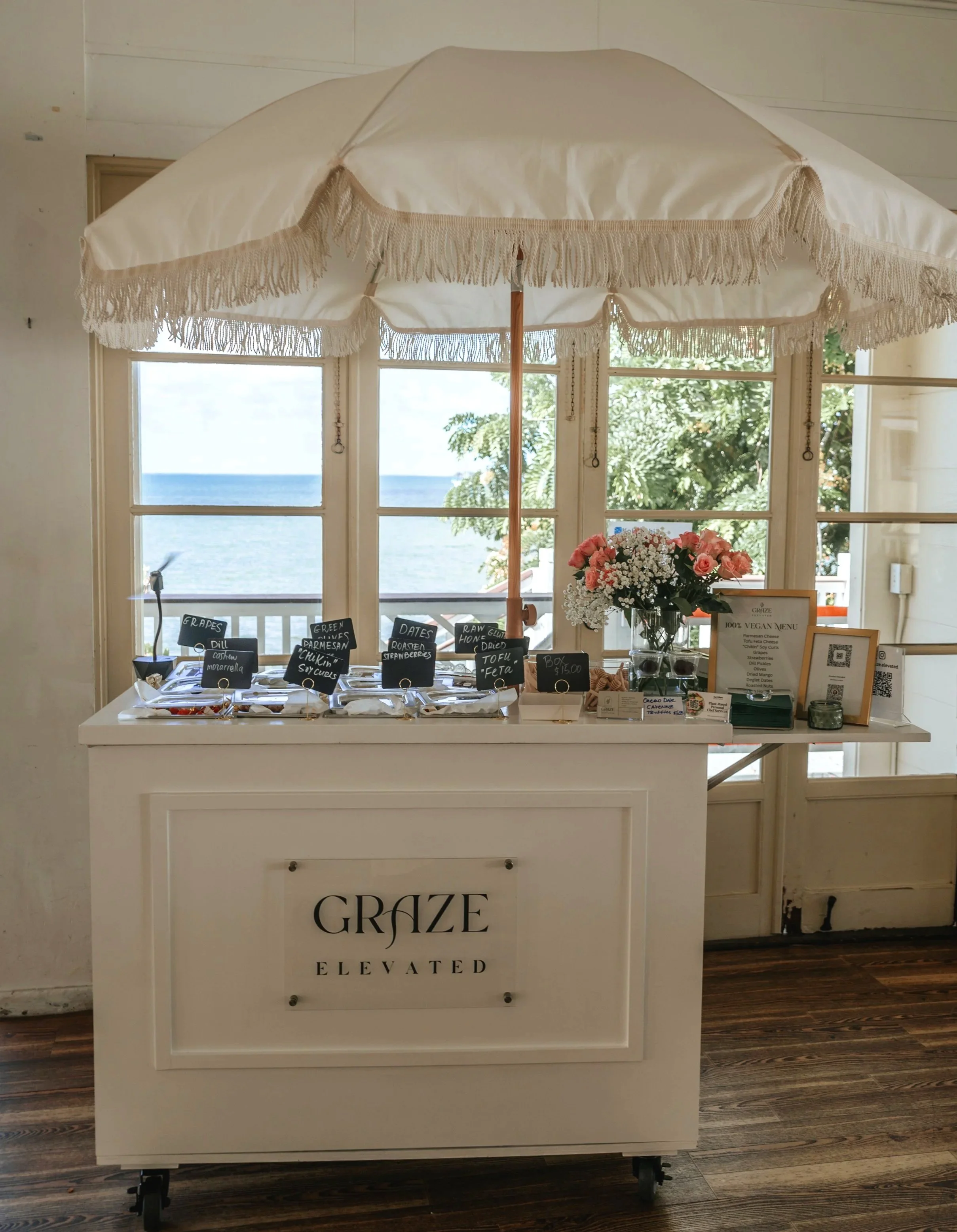 Our mobile vegan grazing cart features a curated 13-item menu of chef-crafted vegan cheeses and premium vegan imports, thoughtfully balanced between savory and sweet bites—delivering a delicious, wellness-inspired experience for any event.